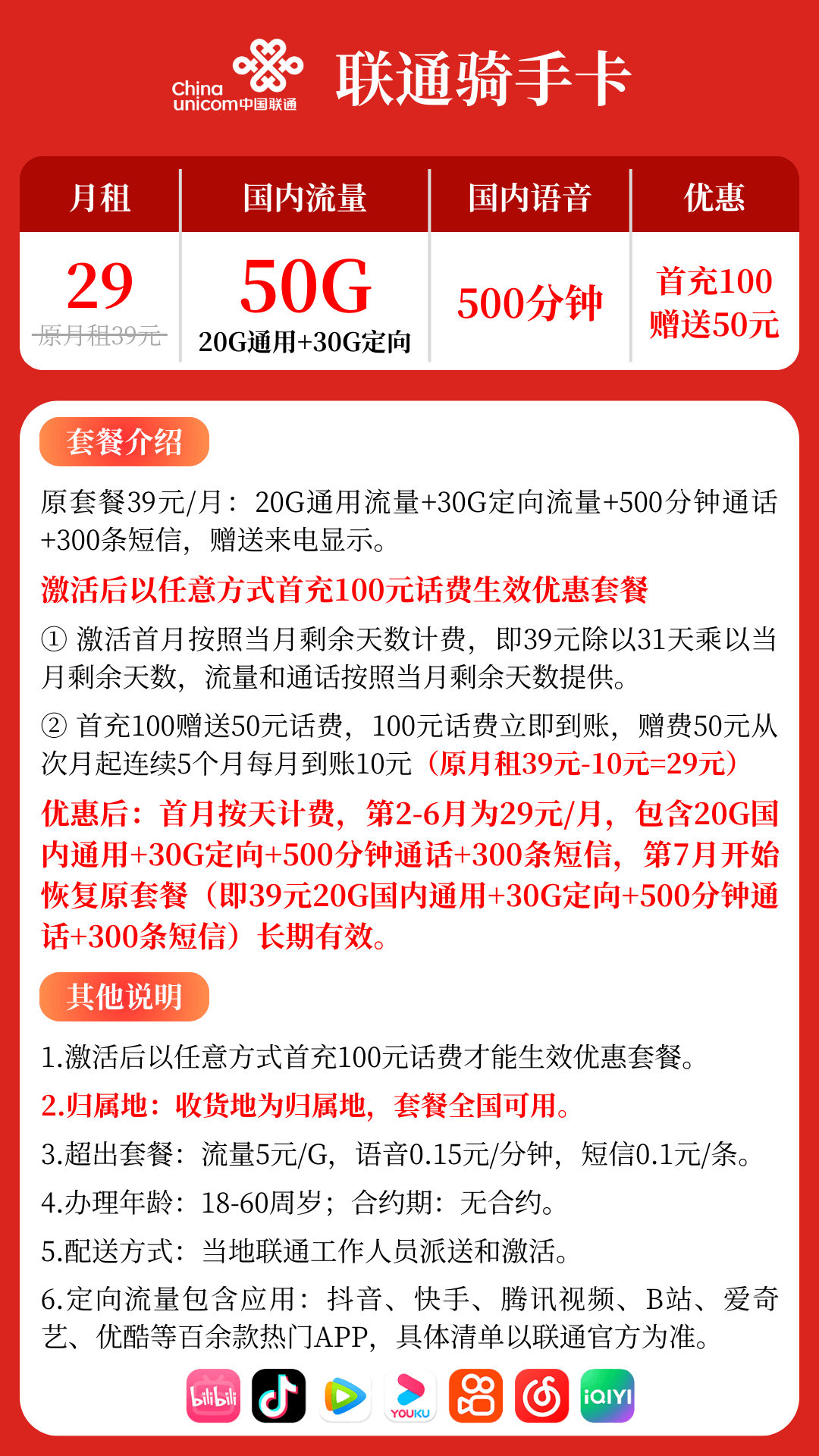 联通小骑手卡 29元50G+500分钟通话+300条短信